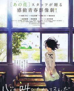 《心灵想要大声呼喊。》是由长井龙雪执导、冈田麿里编剧、A-1 Pictures制作的一部动画电影,本作也是由曾经打造过《我们仍未知道那天所看见的花的名字。》(以下简称《未闻花名》)的原班团队打造的第2弹青春群像剧。电影于2015年9月19日上映。作品同《未闻花名》一样以日本的秩父市为舞台。 故事围绕着在小时候被蛋之妖精封印了言语的女高中生成濑顺,讲述了她与同班同学坂上拓实、仁藤菜月和田崎大树等人的纠葛和羁绊的青春群像剧。 闭锁在心之壳中的,无法对任何人说的心情。 然而,实际上,想要将真正的心情呼喊出来。 在年幼时由于不经意间说出的话语,导致家族四分五裂的少女·成濑顺,在突然现身的“蛋之妖精”面前,为了不再伤害他人,她的言语被封印,并被施加了一说话就会肚子痛的诅咒。从那以来,抱持着心理阴影,她的心灵也因此闭锁,唯一的交流手段只剩下手机邮件。 升上高中二年级后,顺在某天被班主任任命为“地域沟通交流会”的实行委员。一同受到任命的是完全没有交集的三名同班同学。无法说出真心话、没有干劲的少年·坂上拓实,被期待前往甲子园、却因为肘部的故障而遭受挫折的前任王牌·田崎大树,以及为恋爱烦恼的啦啦队部优等生·仁藤菜月。他们各自有着心灵的创伤。 由于班主任的希望,交流会上表演的节目决定是音乐剧,不过班上似乎没有人对此感兴趣。但只有拓实注意到了顺的心情,“莫非你想要唱歌吗?”然而顺却没能说出口。之后,“沉默女没可能演得了音乐剧”,同伴们对此产生了争执。看到大家因为自己而争执的样子,顺不由自主地说出“我会唱歌的!”。 到了发表会当天,顺决定将闭锁在心中的“想要传达的真正心情”歌唱出来,但……。