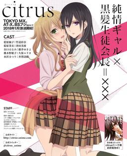 电视动画《Citrus》改编自三郎太原作的同名漫画,于2017年3月25日宣布动画化。动画由Passione负责制作,于2018年1月6日起播出。 虽是辣妹却未经历初恋的女高中生·柚子,由于父母再婚的原因而进入了女子高中。因无法交到男友而不满爆发的转学第一天,她与黑发的美人学生会长·芽衣以最糟糕的形式相遇了。不仅如此,她与成为义理姐妹的芽衣开始在同一个房间里生活……!? 完全相反的两位女高中生,互相排斥又互相吸引。 姐妹的love affair,就此展开!