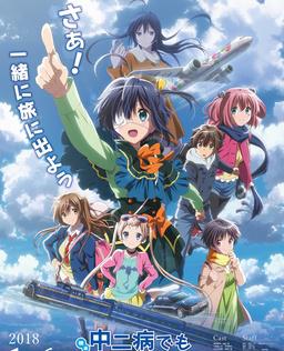 剧场版动画《中二病也要谈恋爱! -Take On Me-》改编自轻小说《中二病也要谈恋爱!》,由石原立也执导,于2018年1月6日在日本上映。 “十八岁。高中最后一年。明明如此,六花却……仍然是个中二病” 升入大学的考试近在眼前,高中三年级到来前的春假。 富㭴勇太和小鸟游六花的共同生活依然一成不变。 但他们的上位契约似乎仍未缔结……。 这样的某一天,六花的姐姐十花宣言要将六花带去意大利。 她说自己的工作已经安定下来,因此要携家迁居。 勇太虽然感到焦躁,但十花却提出了 不能就这么放着考大学也很危险的六花不管,这样的合理意见。 这样下去的话,两人就要被迫分开。 担心他们的丹生谷等一如往常的成员,对勇太提出了“私奔”的提案。 就这样,以日本全国为舞台,两人的逃亡剧就此展开。