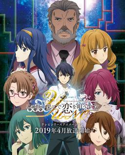 电视动画《世界尽头咏唱恋曲的少女YU-NO》改编自ELF开发的同名游戏,于2016年12月宣布了动画化的消息。动画由feel.负责制作,于2019年4月播出。 主人公·有马拓也幼年丧母,身为历史学者的父亲也在两个月前因事故去世。 在各个方面都失去了活力的高中最后的暑假。某天,他收到了装有镶嵌着用途不明的圆镜和玻璃珠的奇妙物体的小包裹。一起送来的信中有着令人想到父亲还活着的内容……?! “今晚10点,带着这个东西到剑之岬来。” 他按照指示前往那个地点,却发现神秘的女性倒在那里。而且,那里还有学园长和神秘转学生的身影。 一瞬间,随着大地的轰鸣,他被光所包围……。 前往并列世界的旅程,由此开始了。