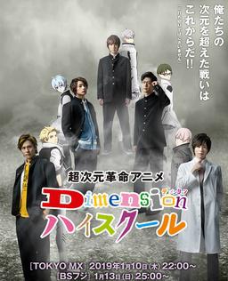 电视动画《Dimension High School》由动画画面与真人画面共同构成,Asmik Ace Entertainment和polygon magic负责动画制作,计划于2019年1月播出。 就读次元高中的白山纯平捡起校园里的石头。绿丘流星、黄川田刚、水上百合和老师桃谷总司一起接受培训的时候,捡到的石头就自动地开动了……开始说话了! “你们才是预言的勇士!希望消灭破坏的魔神”——5个人对于自称是斯普迪奥22世的谜之石的过于现实性的发言无法跟上。切了麻木的假宝石突然发光!醒来发现原来是动画世界啊!? 还有,突然出现的狮身人面像能够让她解开谜团……。 最终,5个人能够回到三维的世界吗?